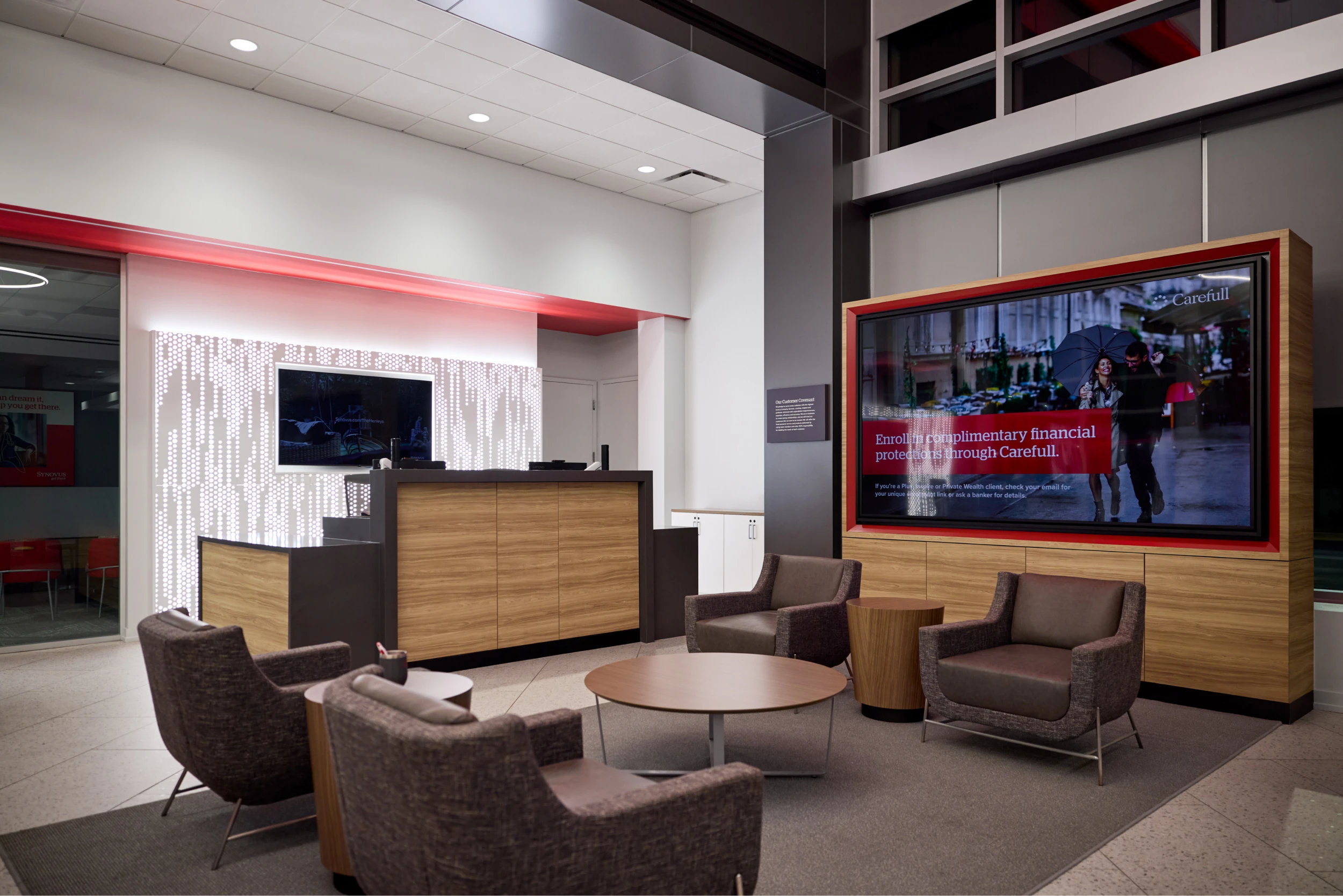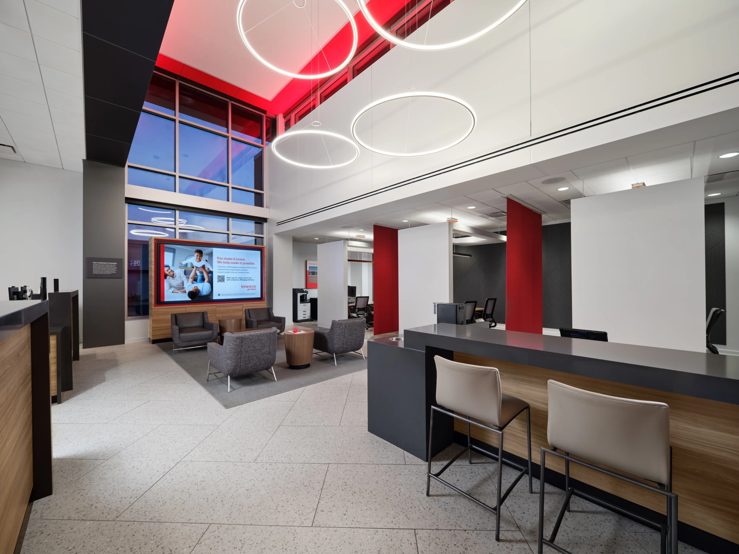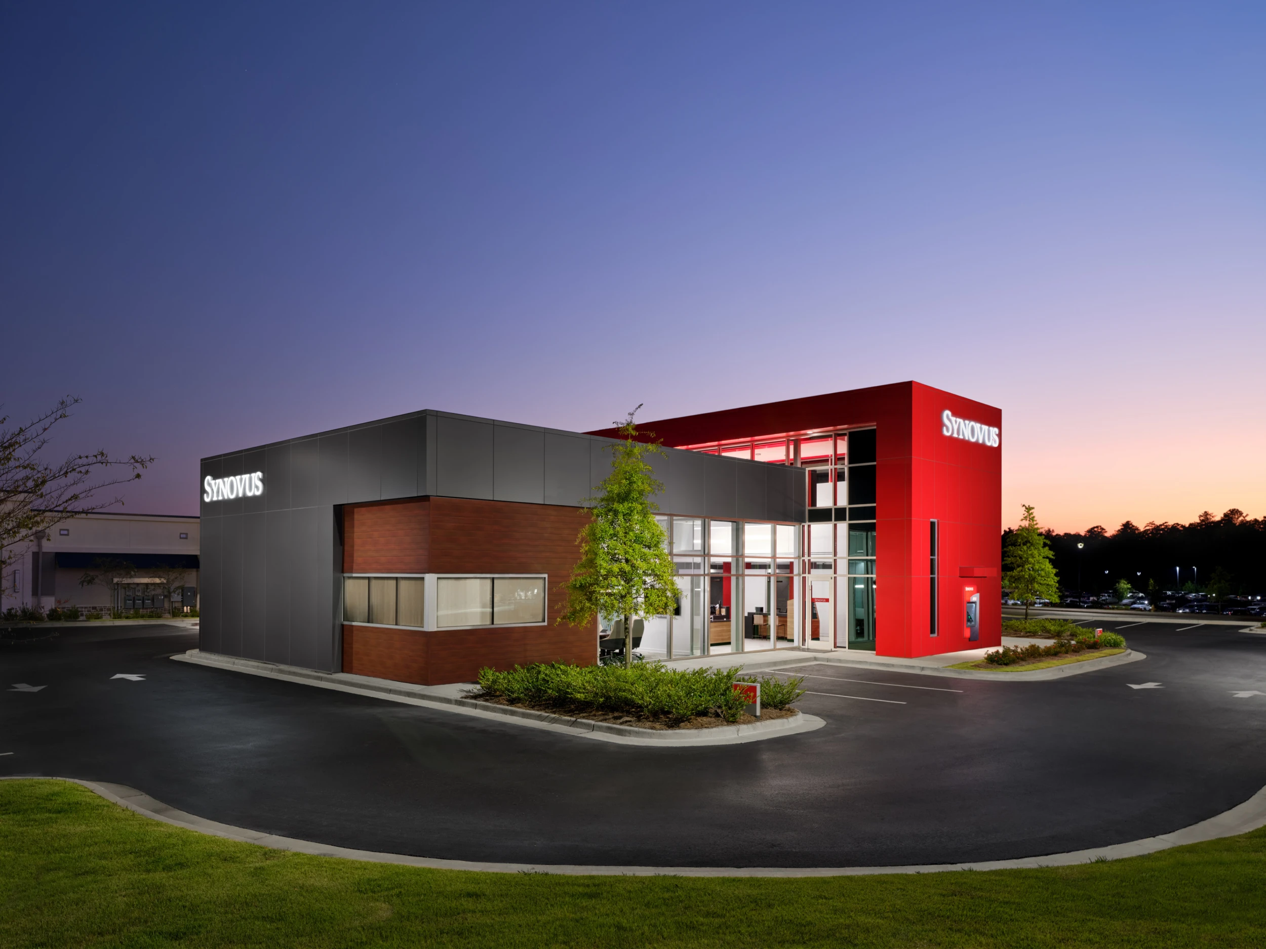 Designed to engage the community from all sides, the building features locally inspired exterior materials that reference the area’s history, along with energy-efficient glazing and shading strategies. The result is a customer-focused branch that reinforces Synovus’ brand while setting a new standard for modern bank design.