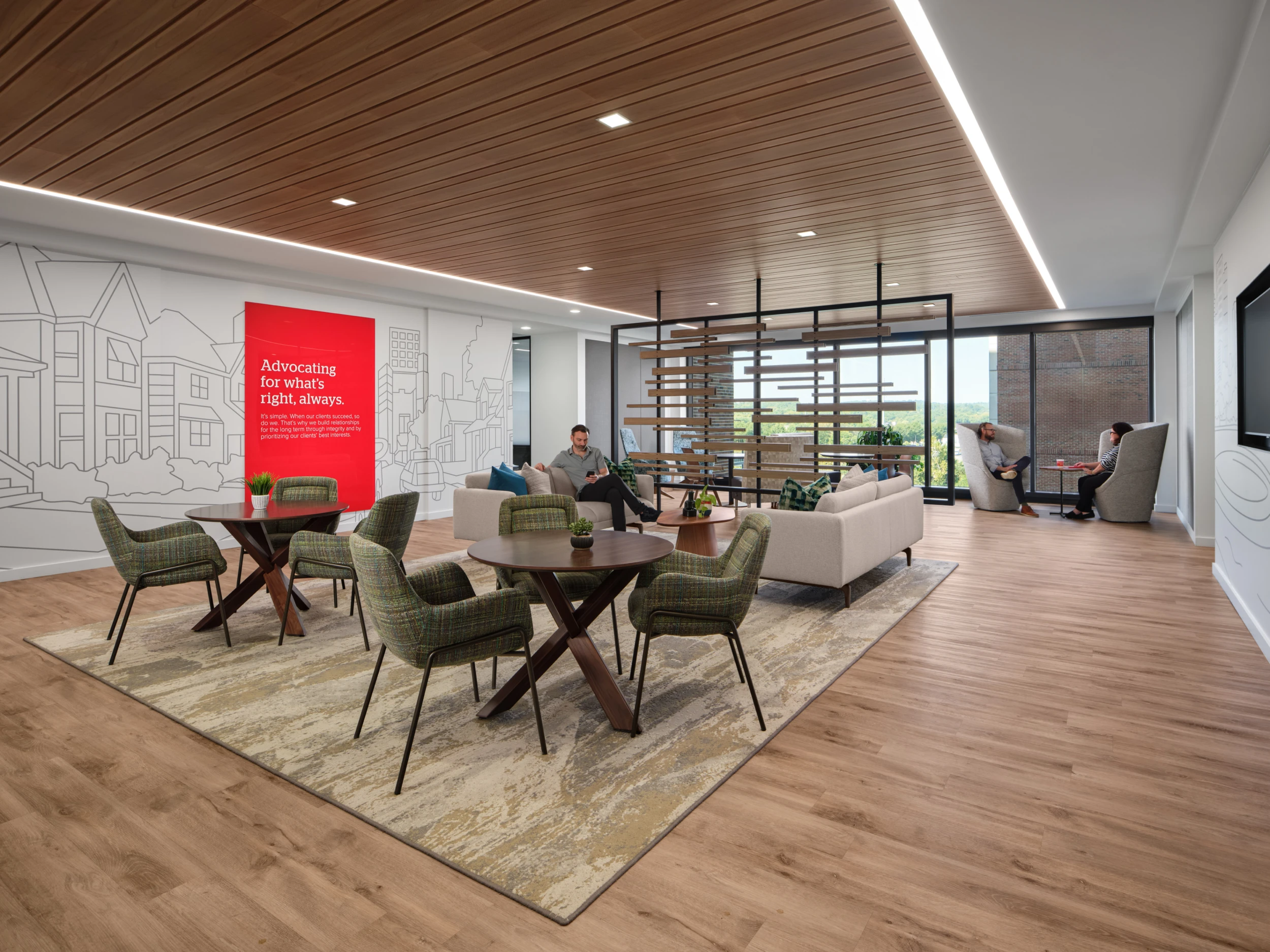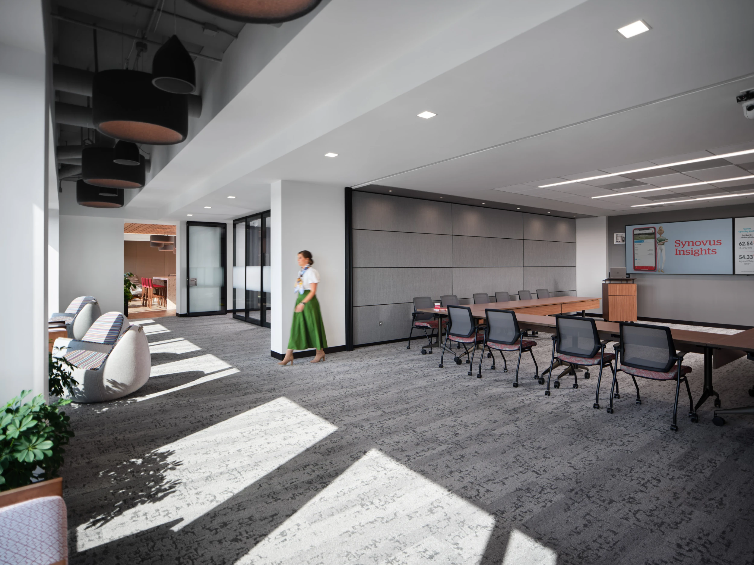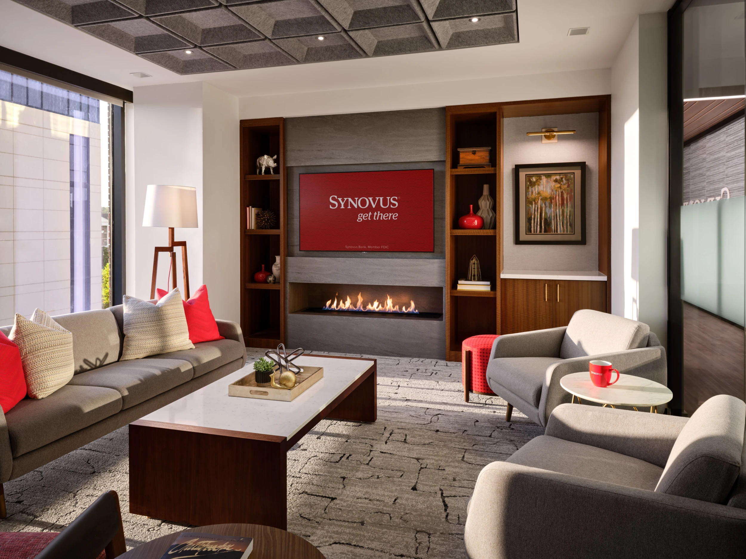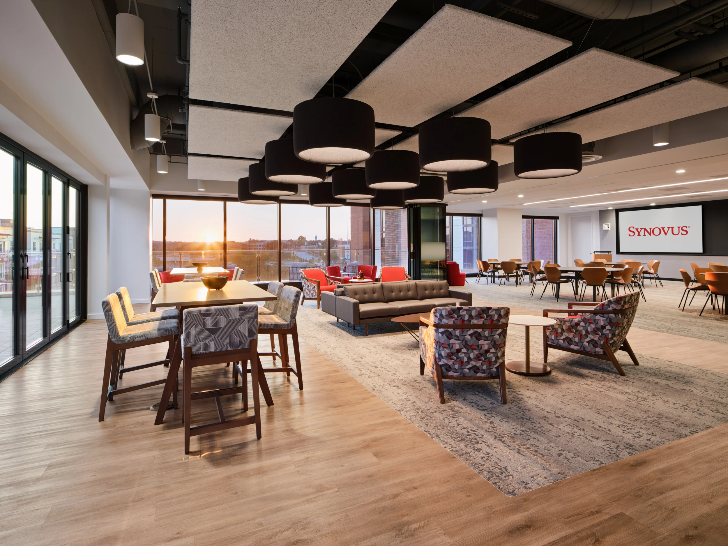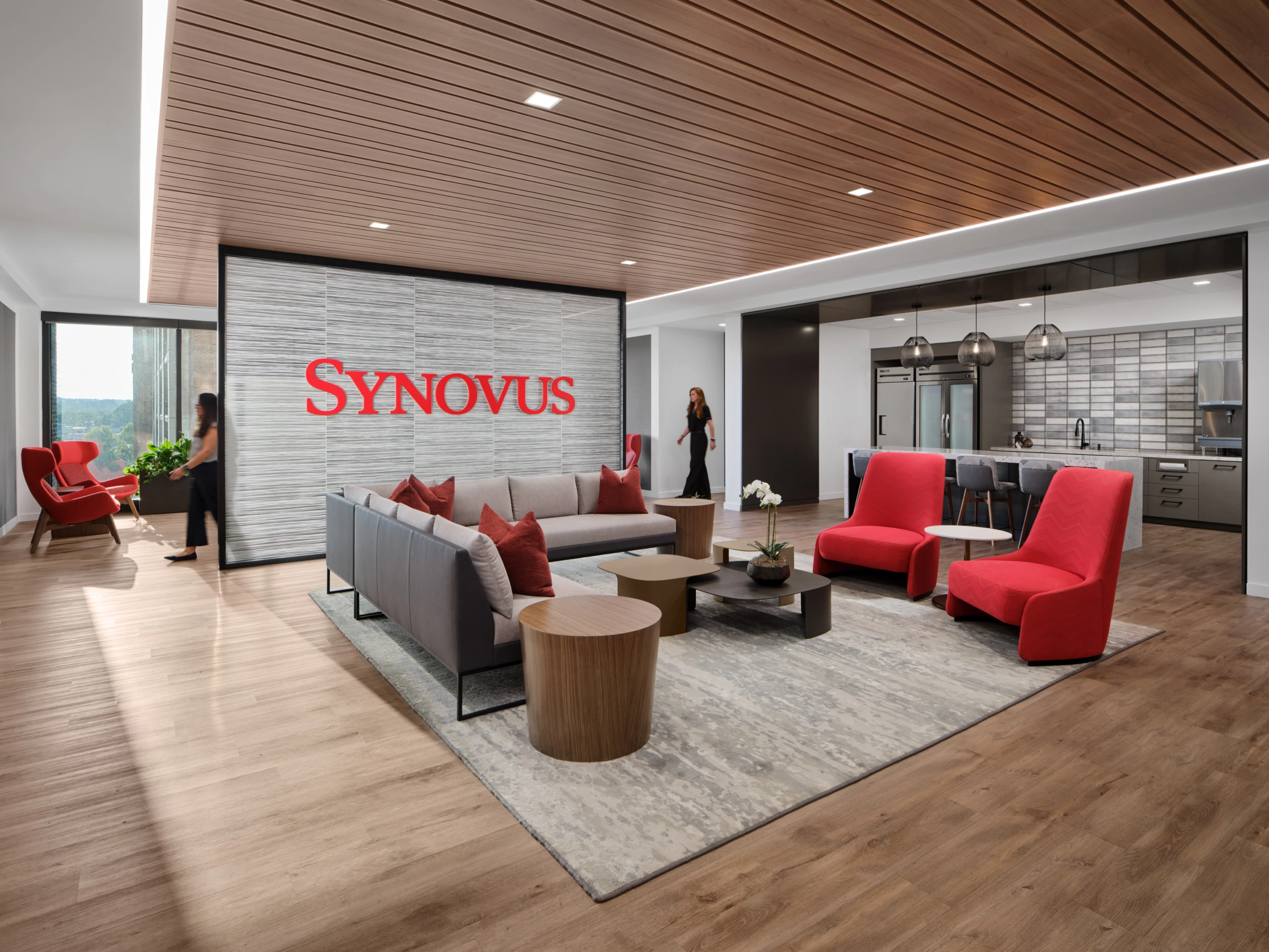 The design prioritizes well-being through natural light, biophilic elements, outdoor terraces, ergonomic furnishings, and spaces for focus, restoration, and social interaction. Integrated brand storytelling connects the workplace to Synovus’ community roots while reinforcing its values and vision for the future.