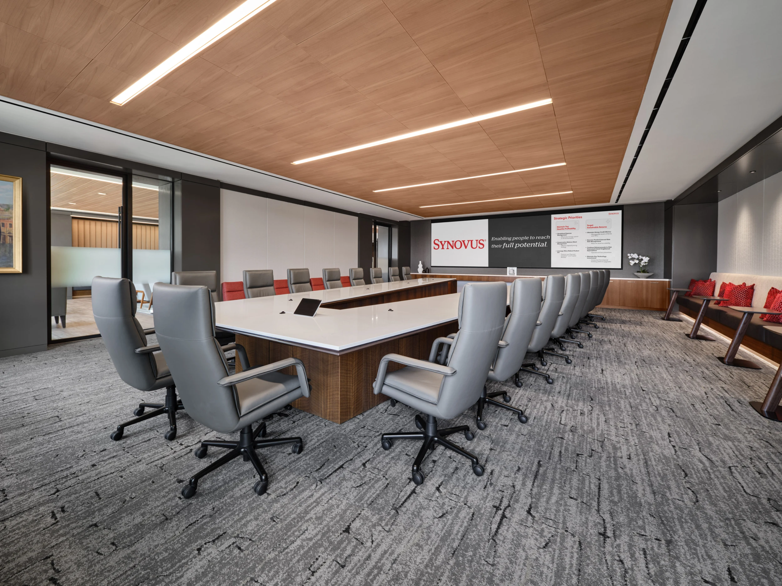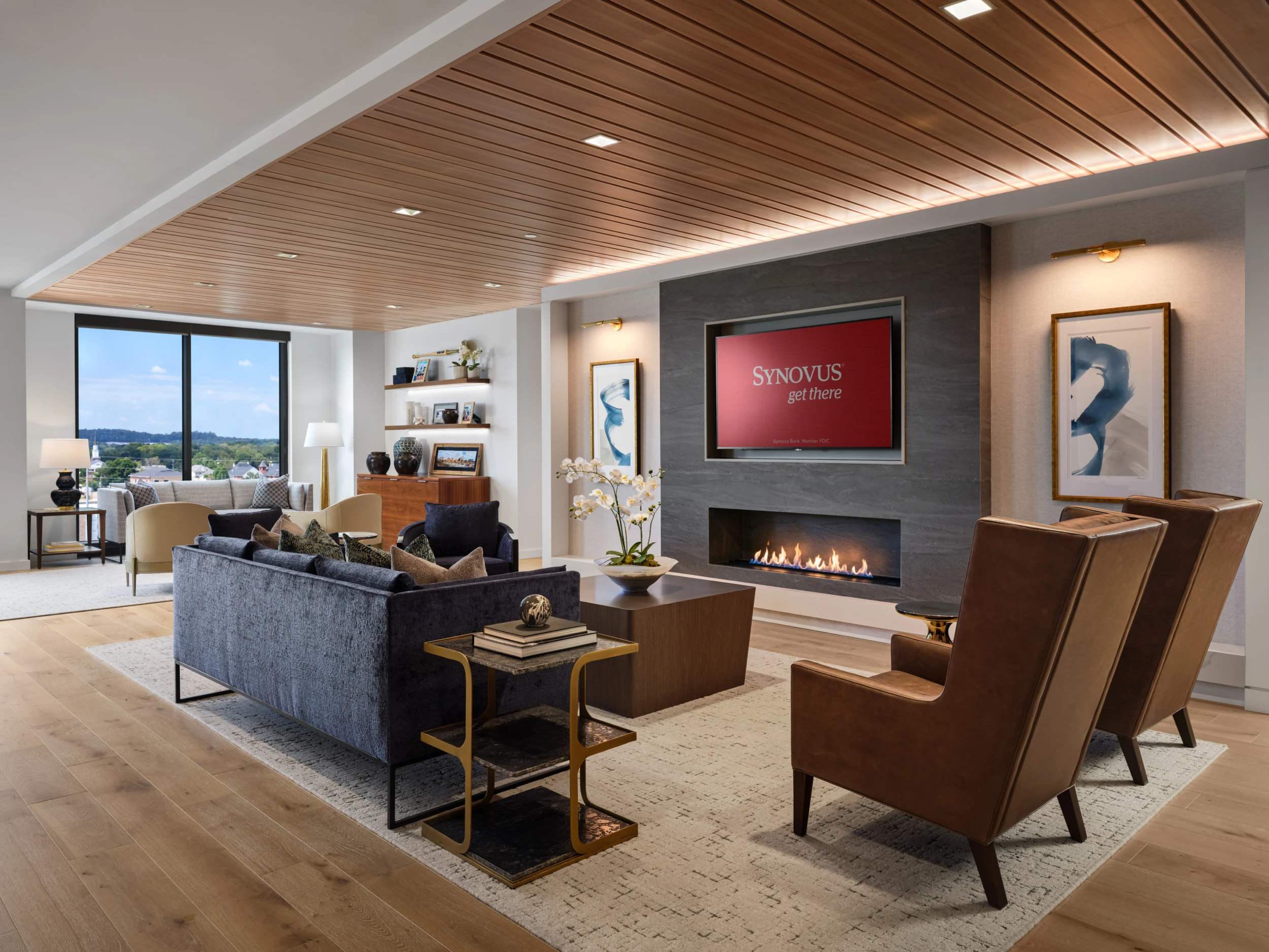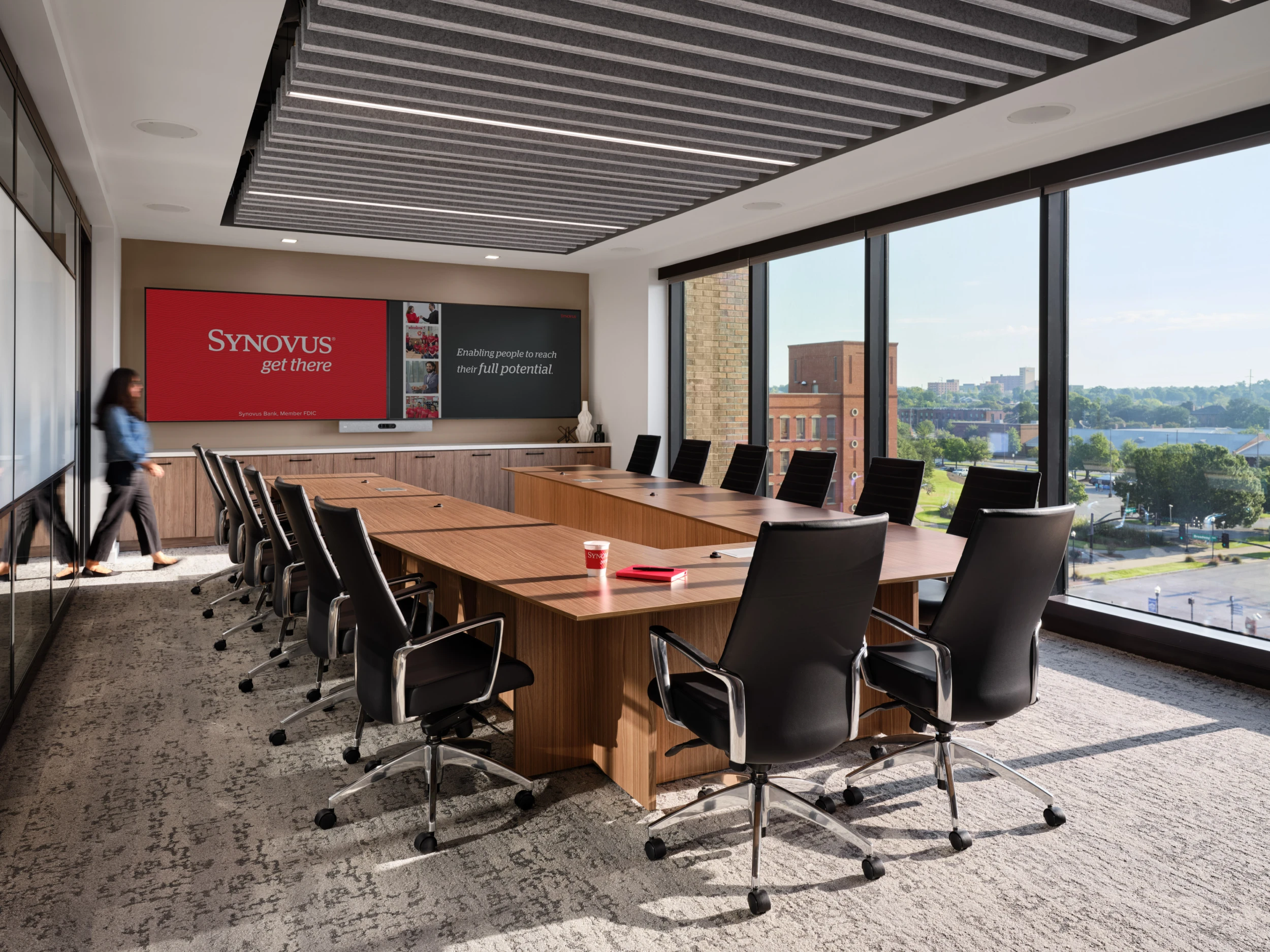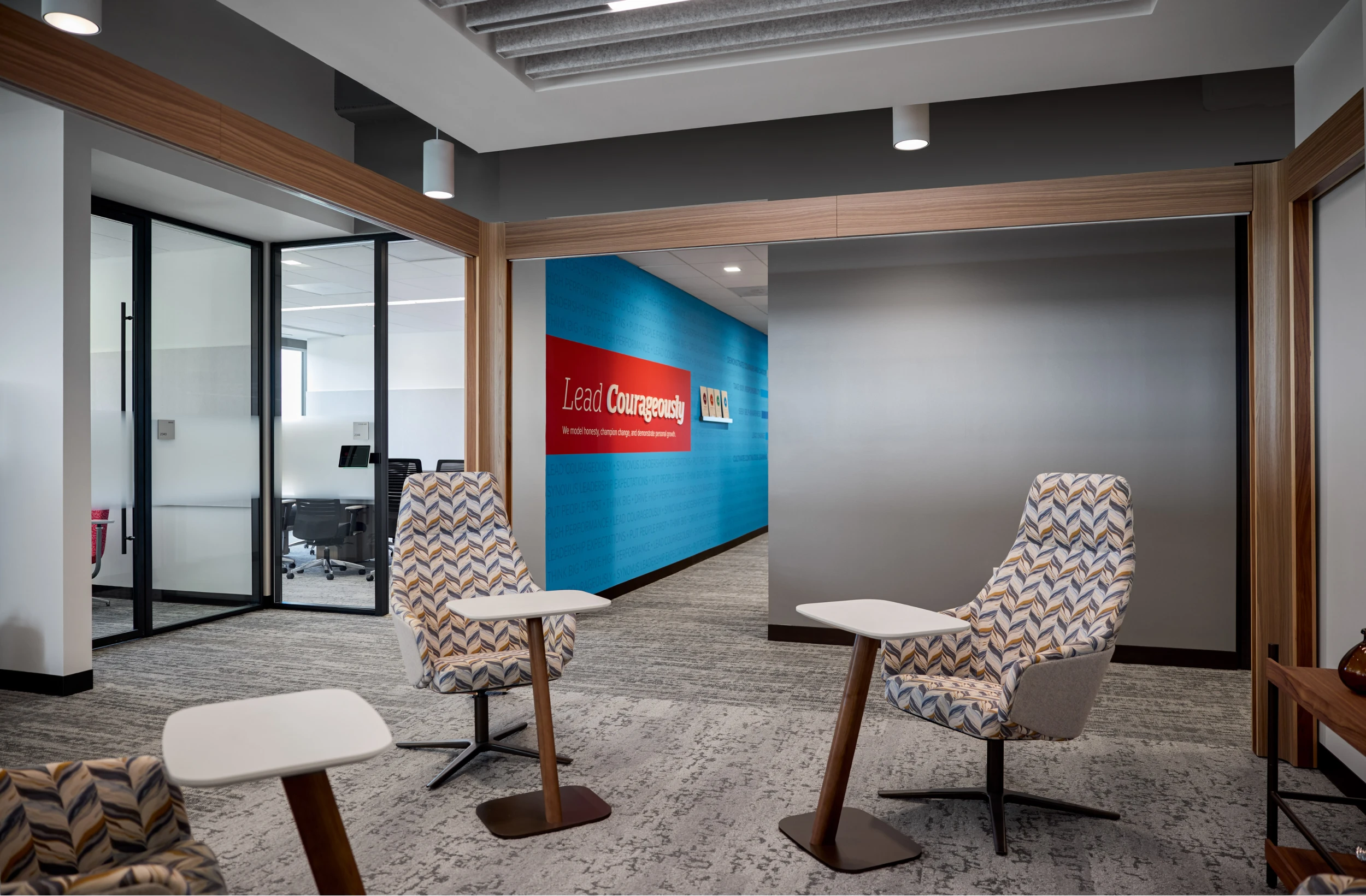 The design prioritizes well-being through natural light, biophilic elements, outdoor terraces, ergonomic furnishings, and spaces for focus, restoration, and social interaction. Integrated brand storytelling connects the workplace to Synovus’ community roots while reinforcing its values and vision for the future.