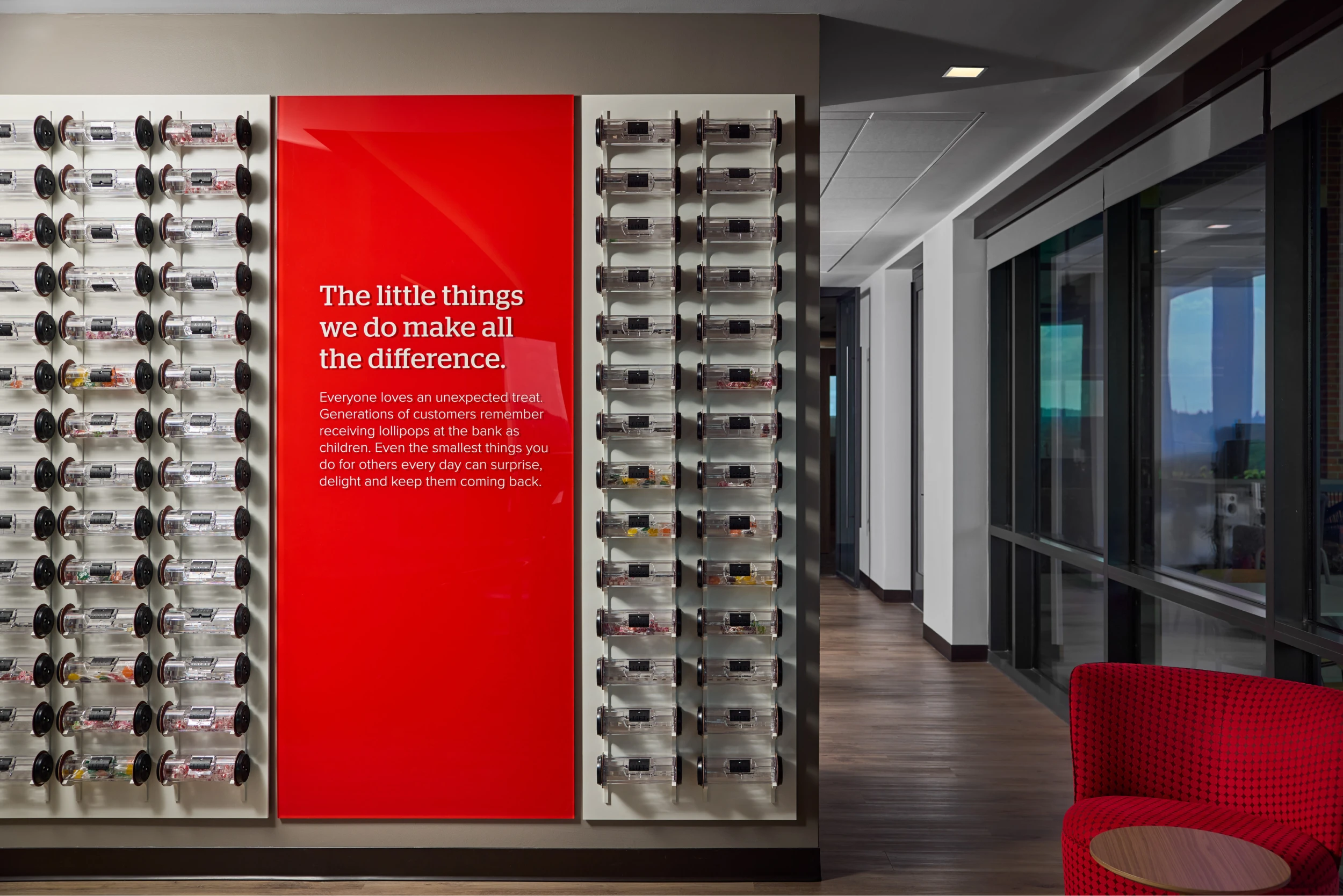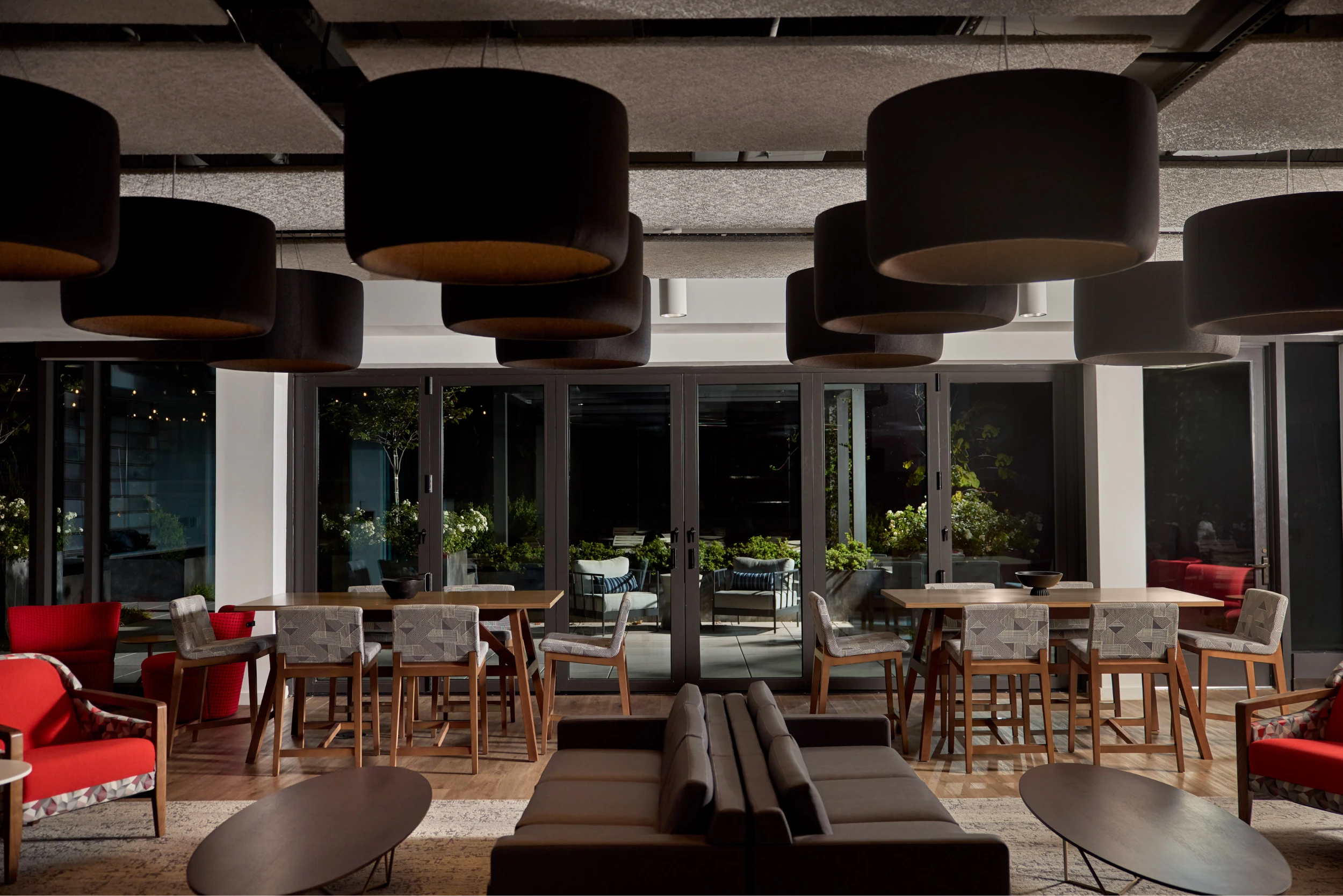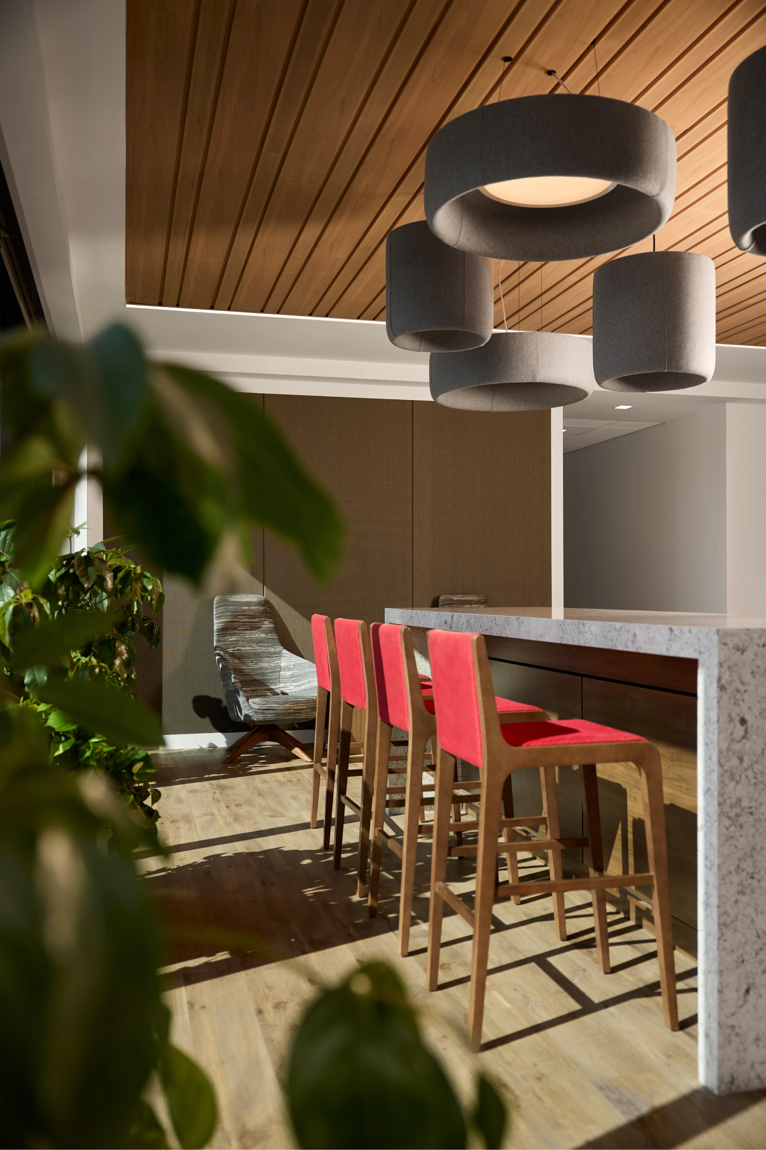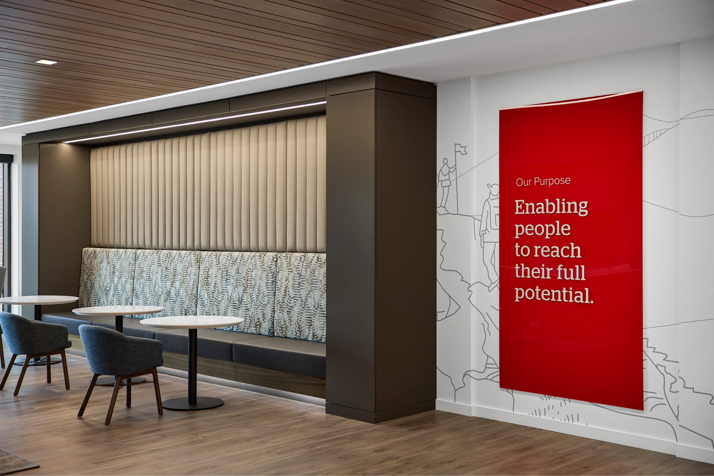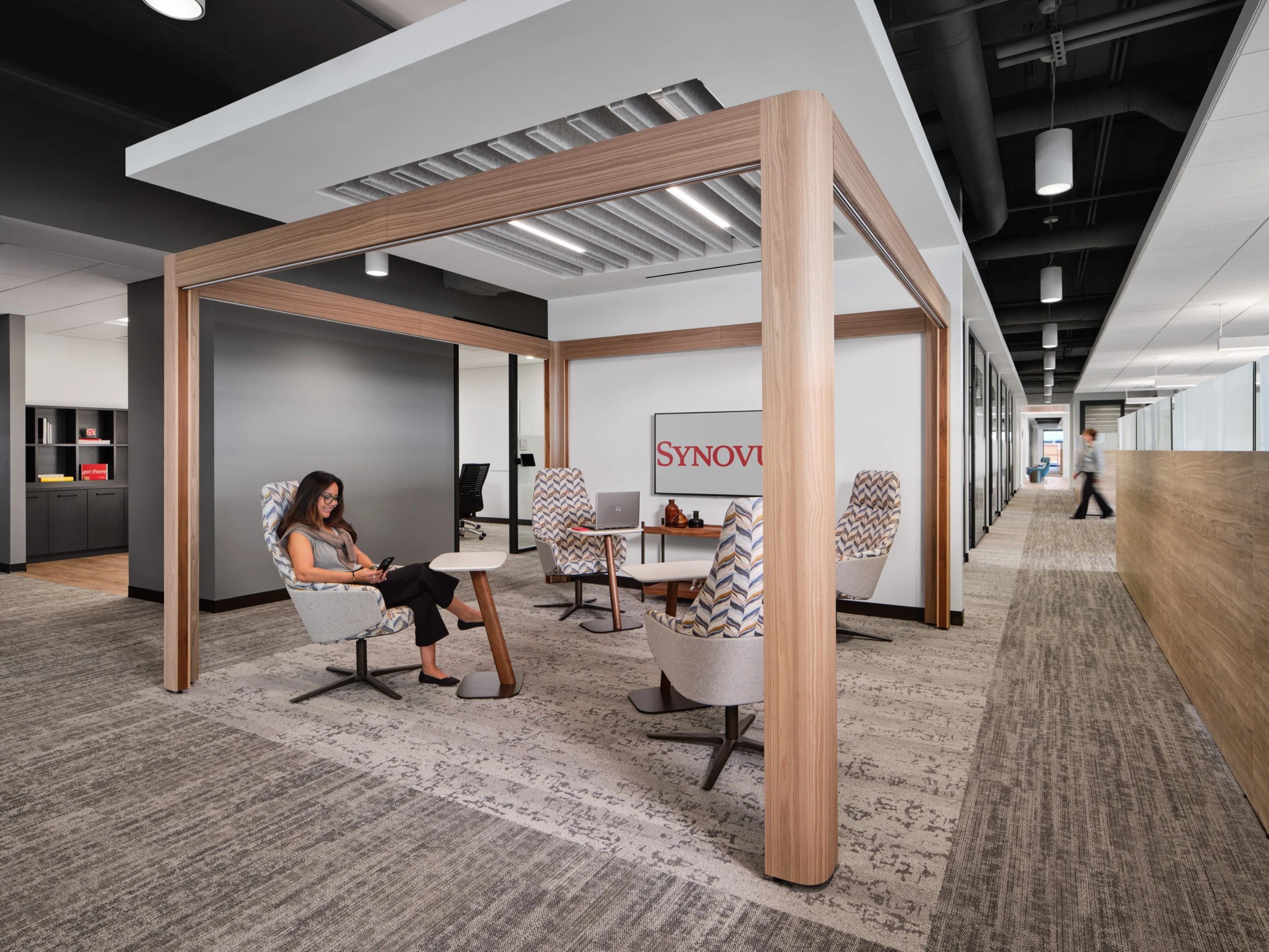 The design prioritizes well-being through natural light, biophilic elements, outdoor terraces, ergonomic furnishings, and spaces for focus, restoration, and social interaction. Integrated brand storytelling connects the workplace to Synovus’ community roots while reinforcing its values and vision for the future.